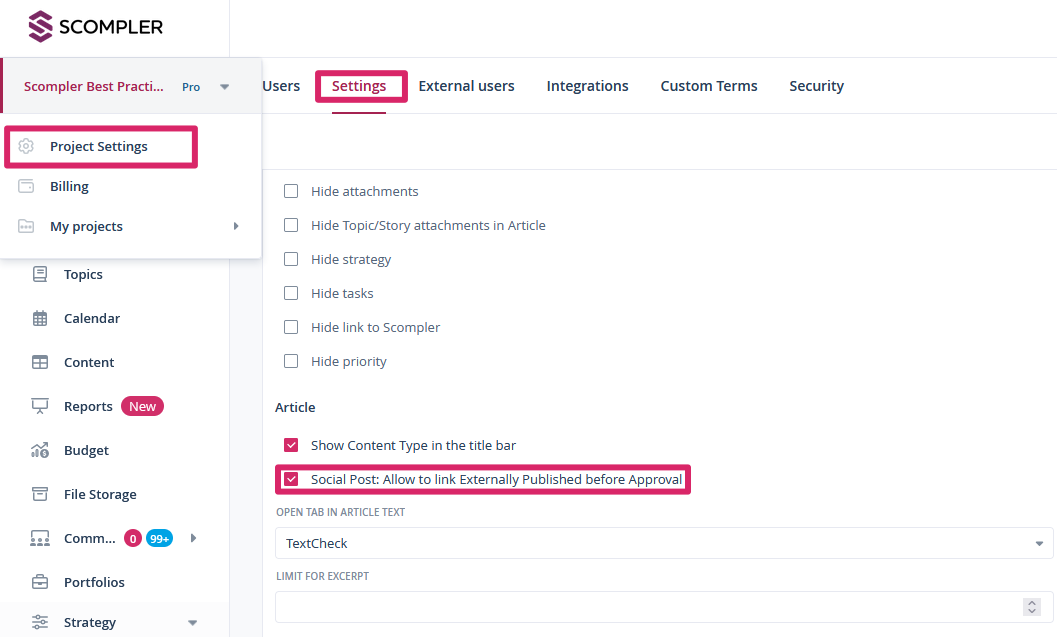 TIP: If you do not want external links to be added before an article is approved, you can disable this in the project settings under the “Settings” tab in the “Article” area: