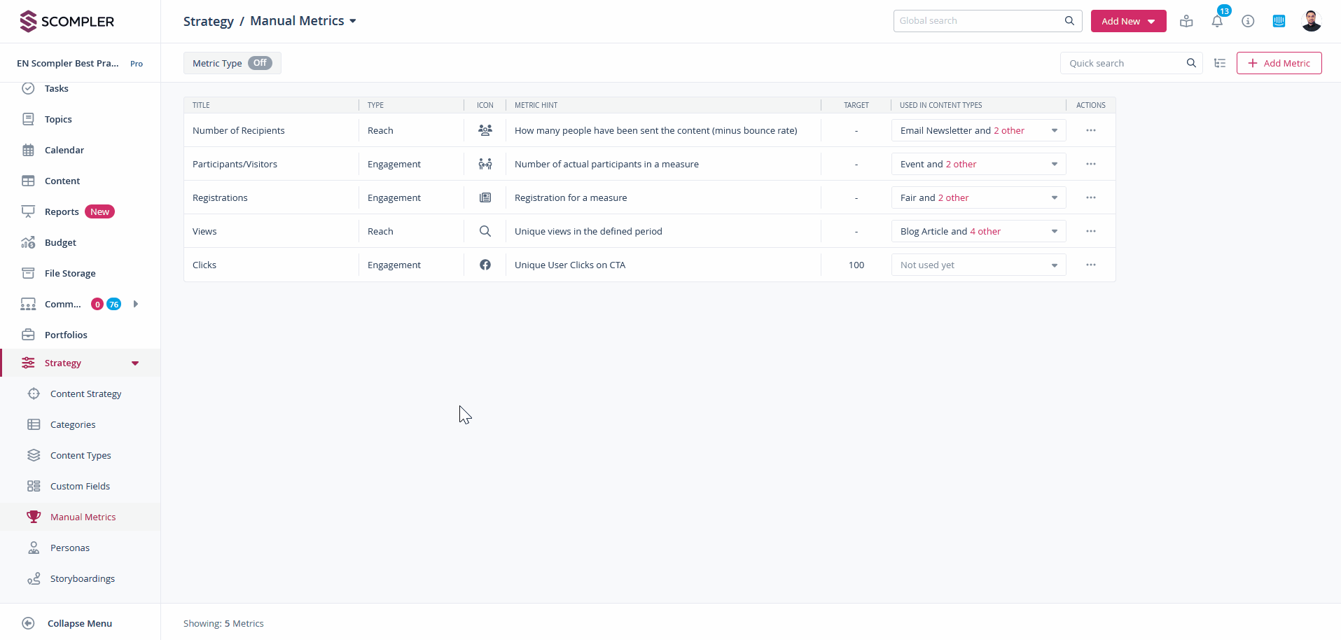 If you would like to add your own metric types, click on the icon to the right of the “Add metric” button. Here you can add new types, rename and delete existing ones. The three standard metric types “Reach”, “Engagement” and “Impressions” cannot be removed or edited.