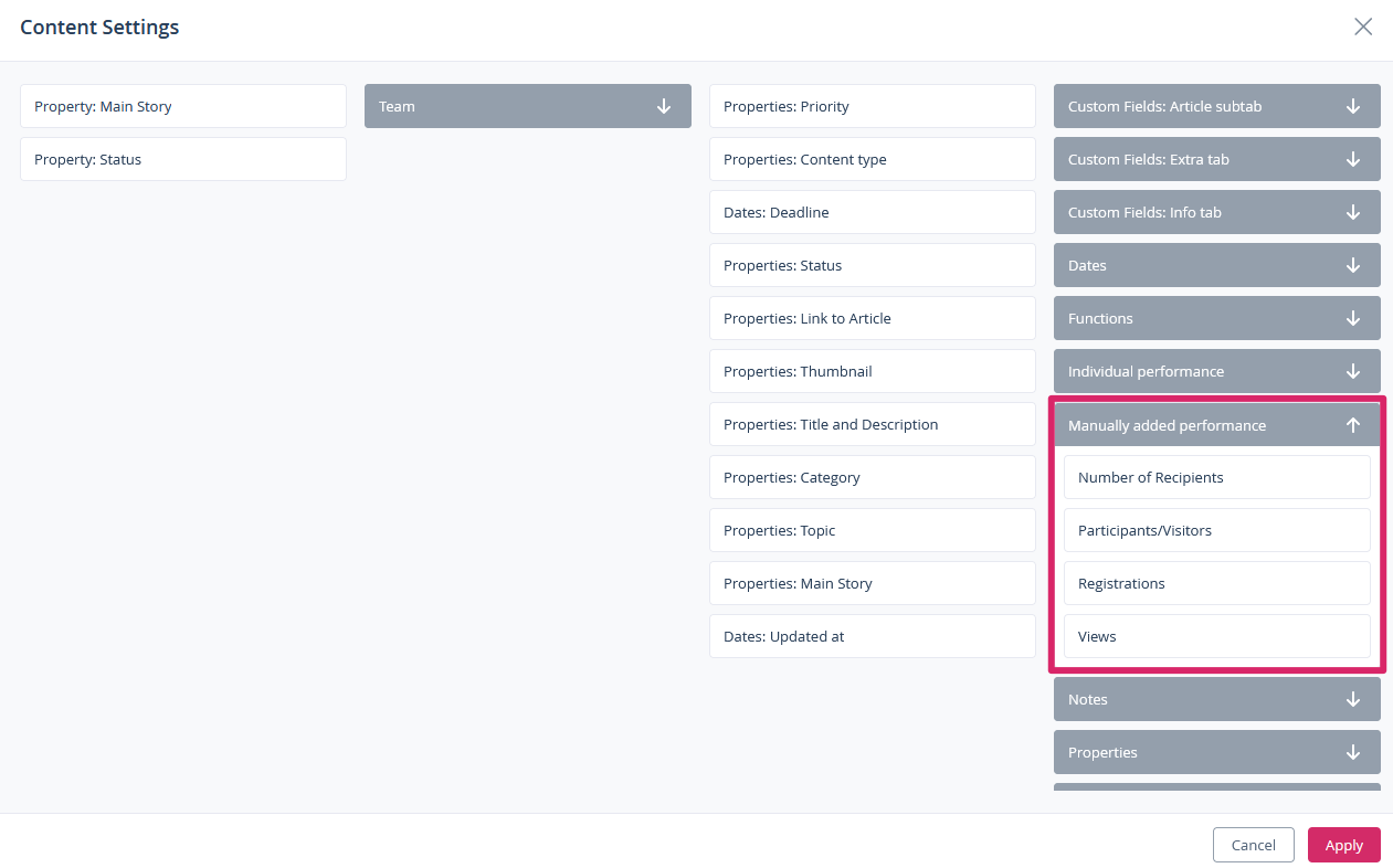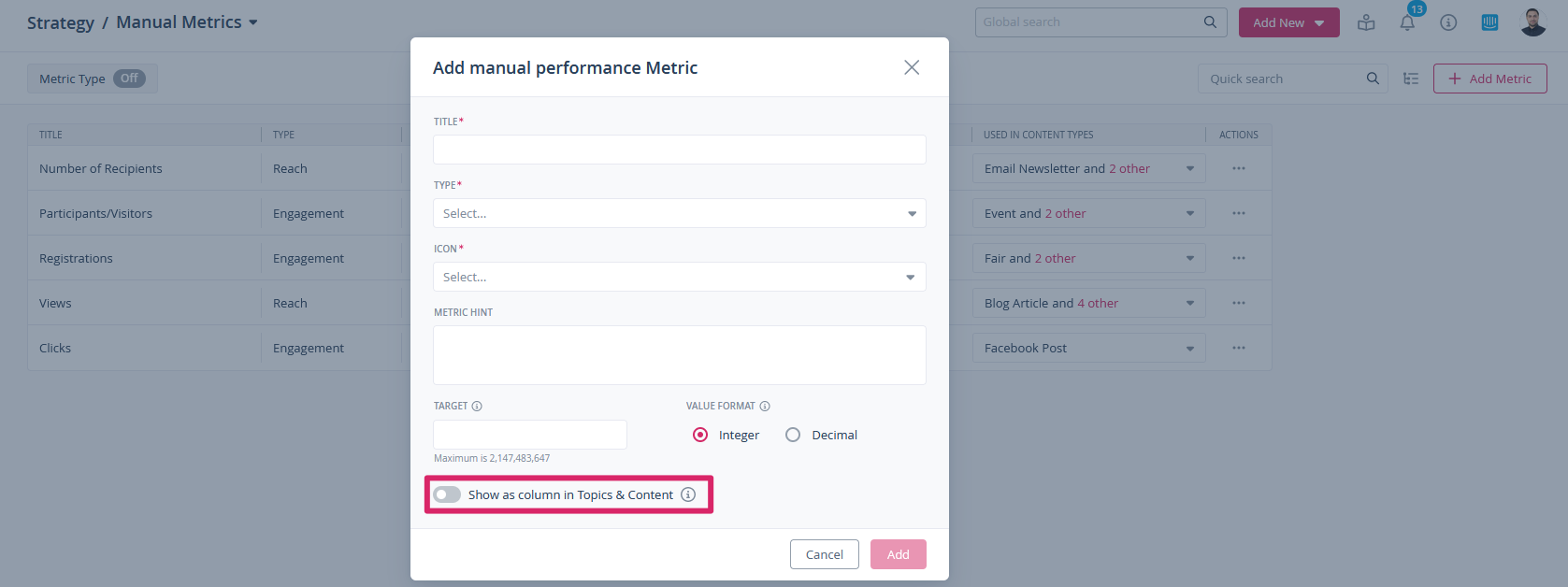 The manual performance data is also available as columns in the Content area. In order for your metric to be displayed, you must activate the following option in the “Strategy” > “Manual metrics” area when creating or editing: