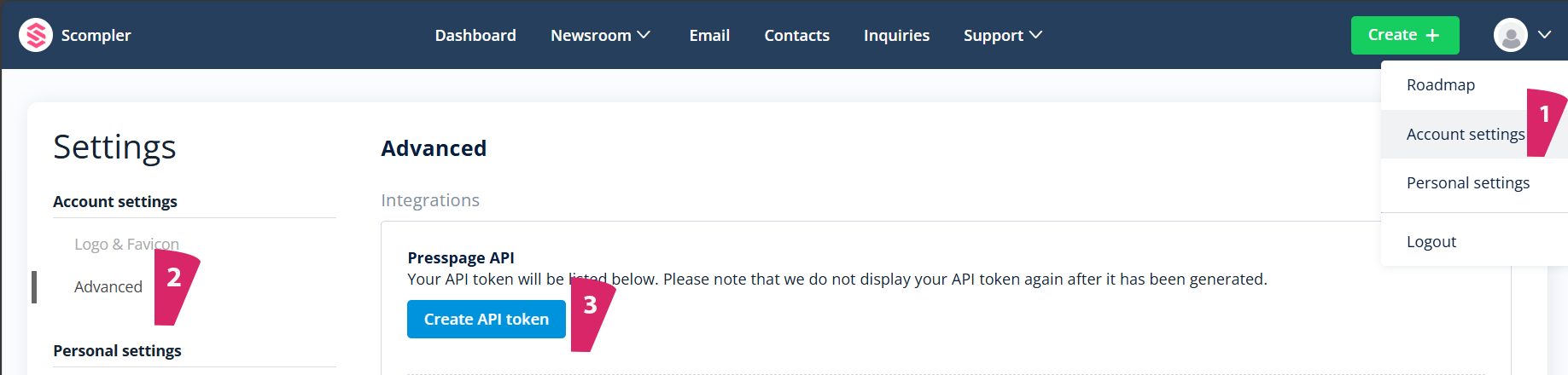To connect Scompler to Presspage, we first need an API token from your Presspage instance. To do this, log in to Presspage and proceed as follows: