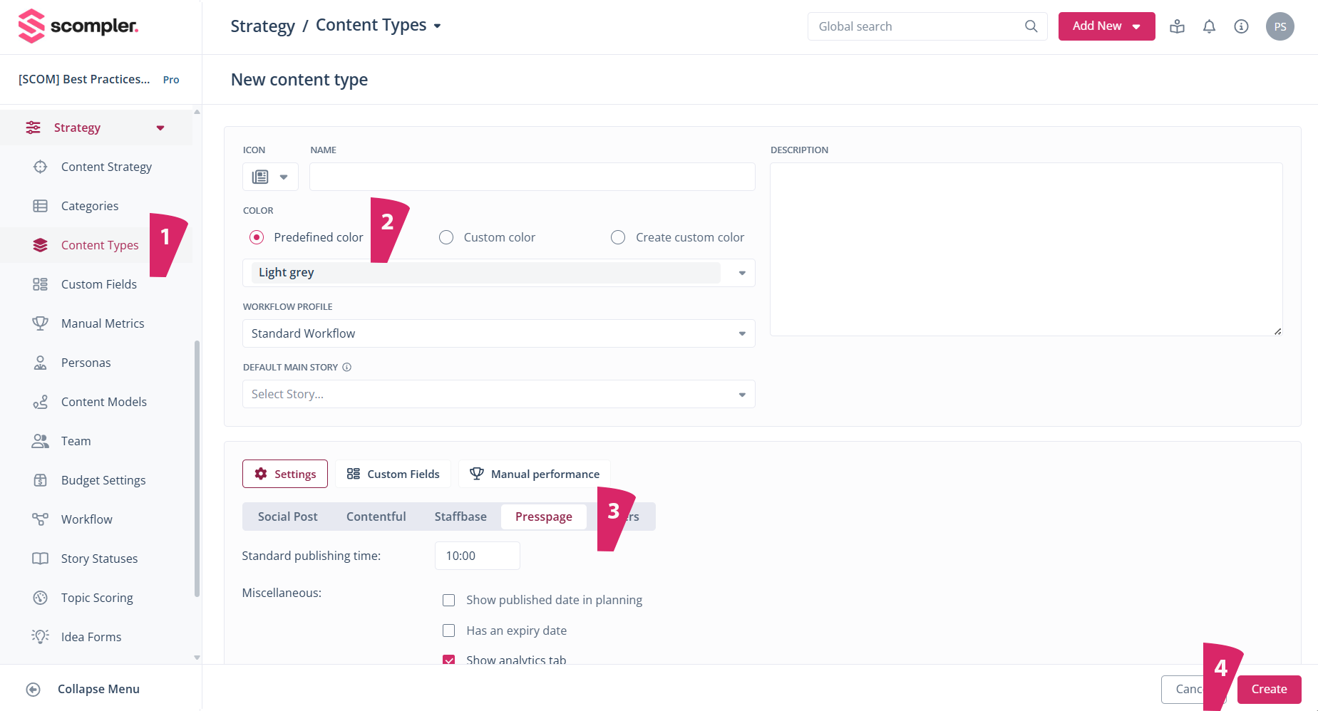 Now you can create and schedule Presspage posts in Scompler as usual – either via the “Add New” menu in the top Scompler bar, via the topic architecture, or in the content area.