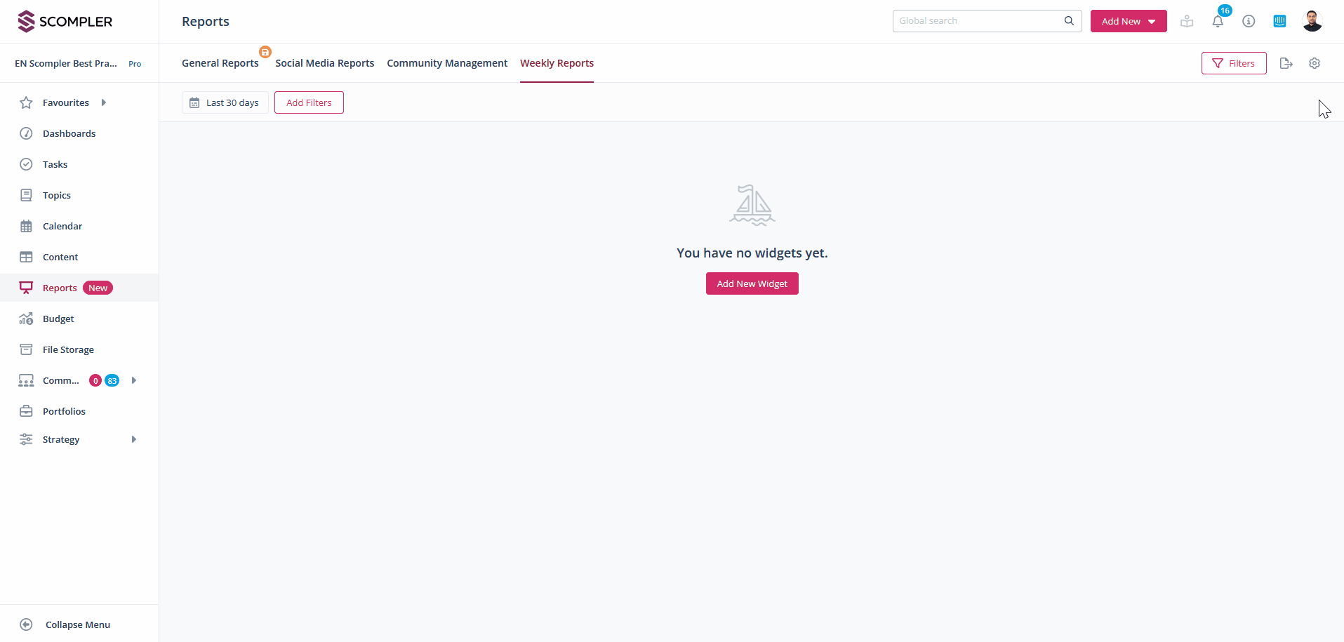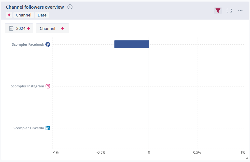 In addition to general widgets, Scompler offers you specific social media widgets in the reports section. These allow you to keep an eye on how your social media channels and actions are performing.