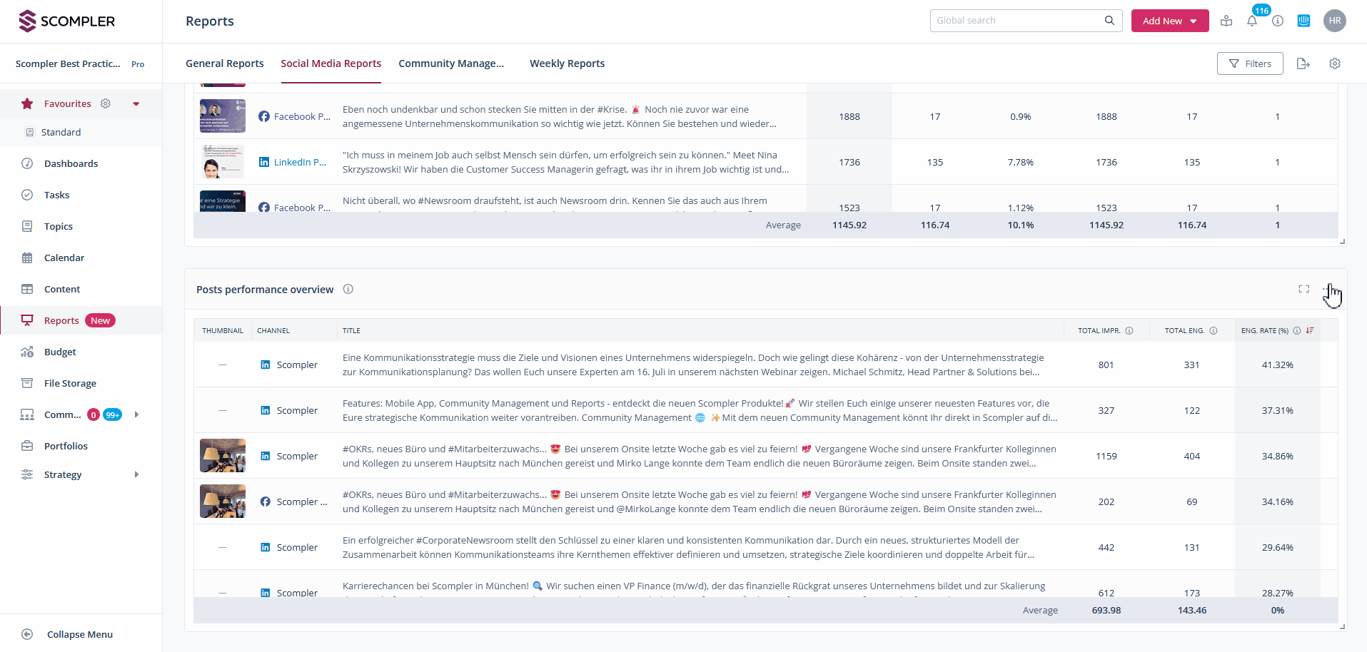 With these widgets, you have further options in addition to the usual filter options: You can set how many entries are displayed, sort by reach, engagement, impressions, comments, click-through rate, likes and shares in ascending or descending order and set the type of calculation line that is then displayed below the values. The latter offers the options median, average and total.