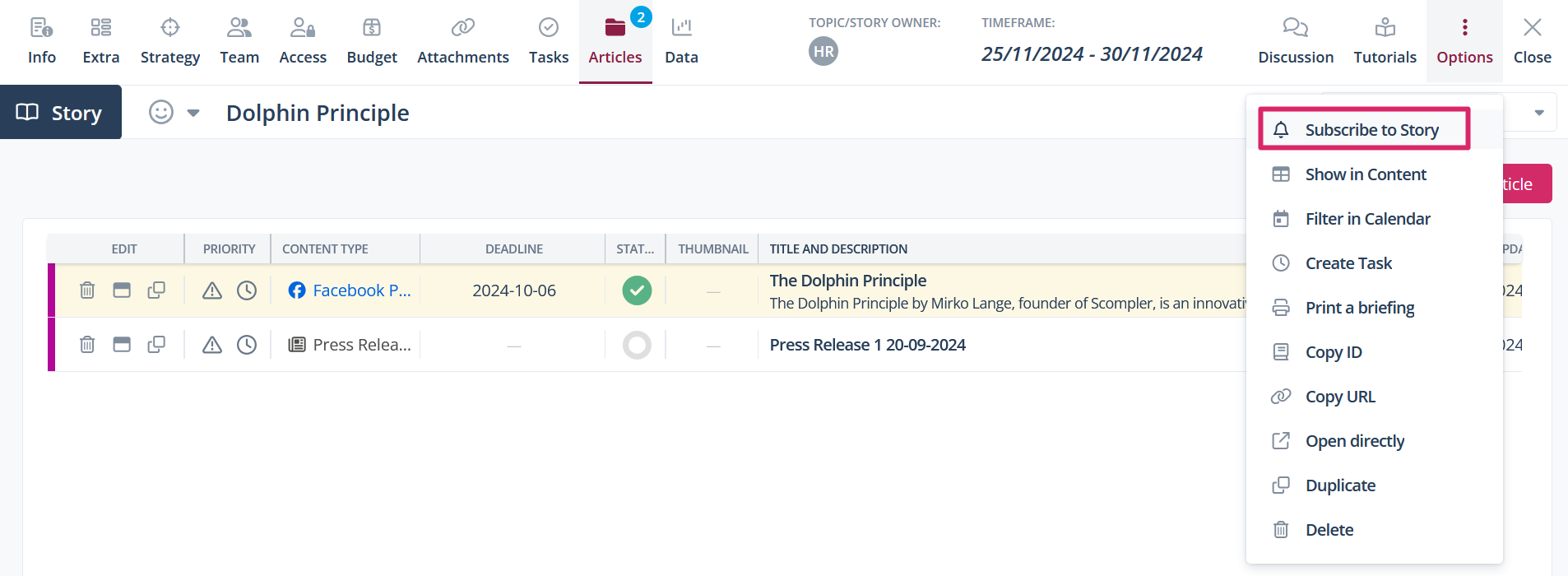 - Select the option “Subscribe to Story”. When you activate this function, you will be notified when new articles are created in this story.